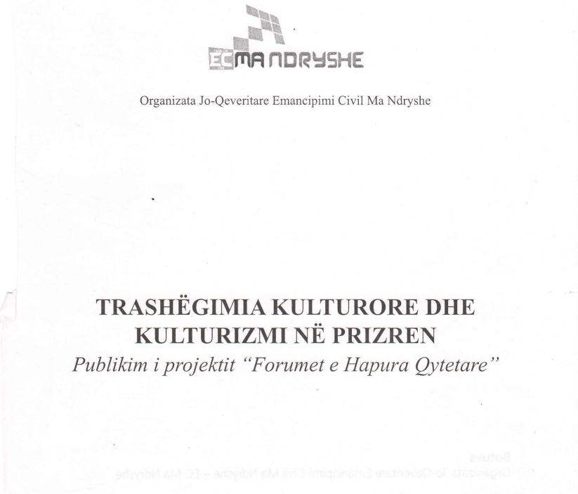 Ky publikim është rezultat iprojektit “Forumet e Hapura Qytetare”, implementuar nga EC Ma Ndryshe në financim të Fondacionit të Kosovës për Shoqëri të Hapur (KFOS) dhe Fondacionit Trashëgimia Kulturore pa Kufij (CHëB). Qellimi kryesor i projektit ishte nxitja e debatit p€r ndryshimin e qasjes ndaj pasurisd kulturore td qytetit të Prizrenit, me theks të veqantë […]